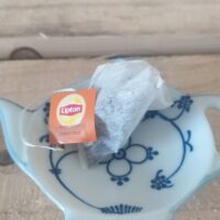 Theetipje in de vorm van theepotje, blauw saks